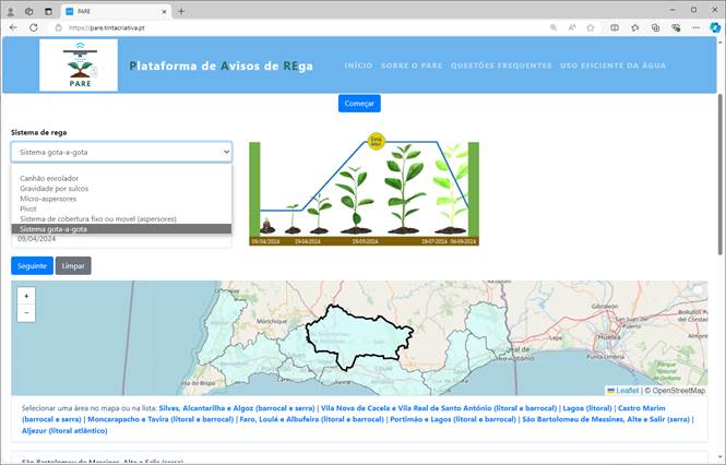 Nas imagens da Figura 2 são apresentadas algumas imagens sobre a Plataforma de Avisos de Rega -PARE, disponível através de https://pare.tintacriativa.pt/.